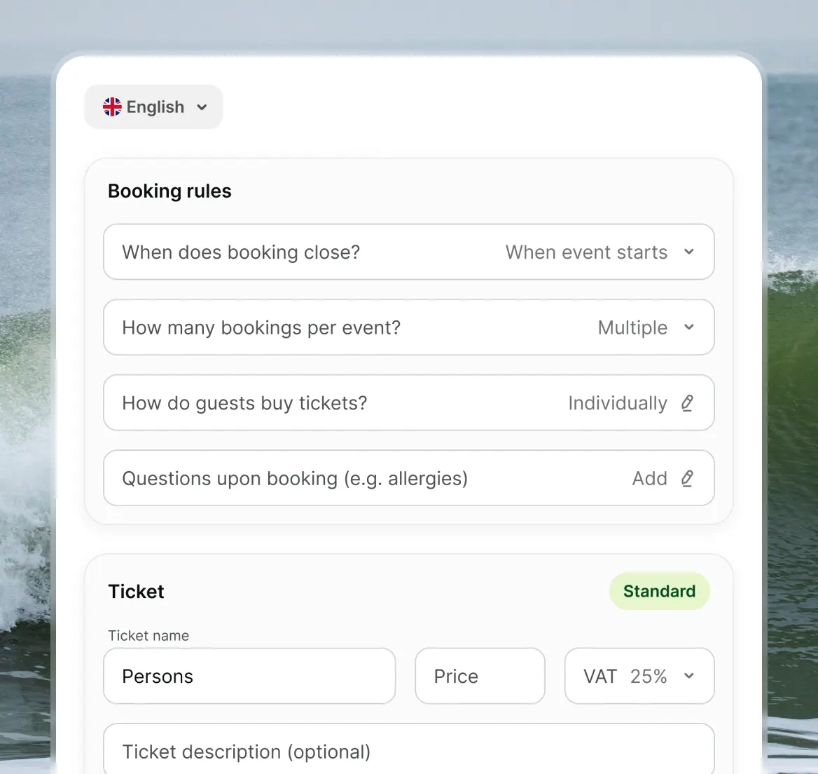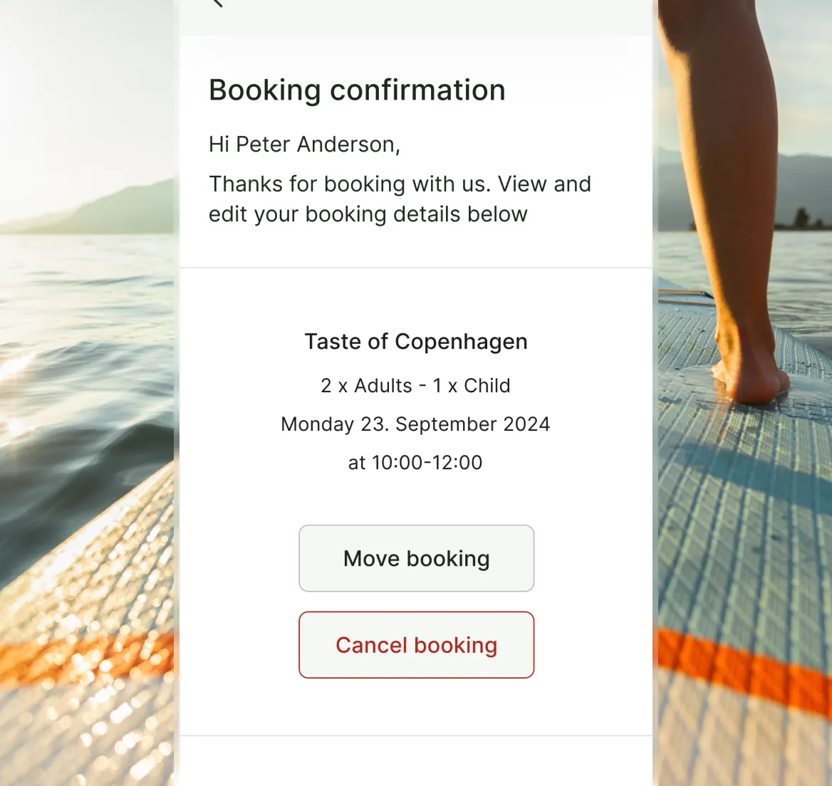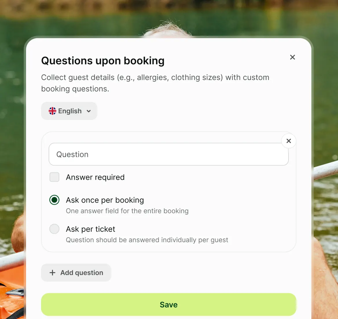 Adults, kids, couples, families – set up ticket types that fit how people book. Then let guests add extras at checkout: kayak rental, equipment hire, a photo package, a post-session drink. They build their own experience, you earn more per booking.